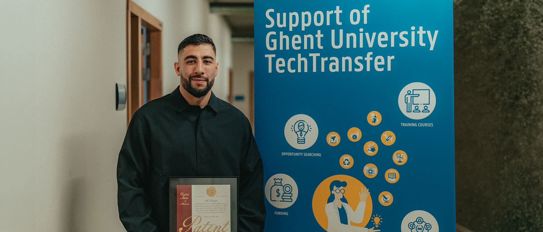 Met zijn student-ondernemer-statuut klopt hij aan bij textielkunde en tech transfer. Daar ontdekt hij dat er wel een statuut is, maar geen traject voor een student die zelf met een technisch concept komt en er onderzoek rond wil bouwen. Na twee jaar opent hij zelf een pad en werkt met prof. Lieva Van Langenhove een IOF-dossier uit van 100.000 euro.